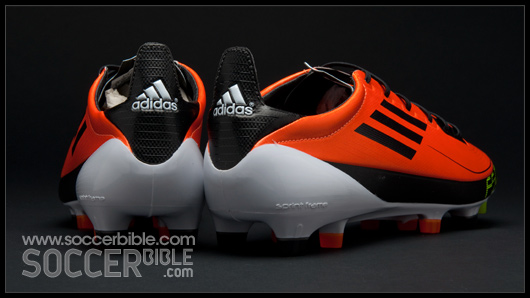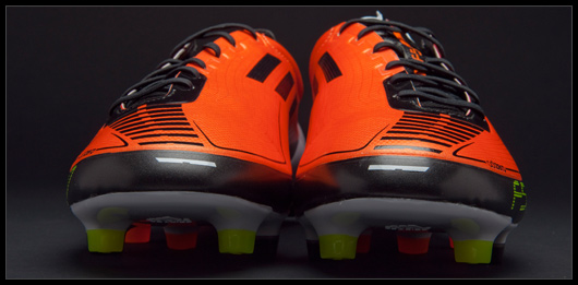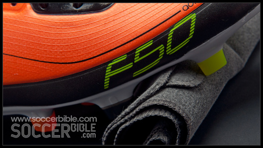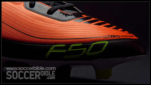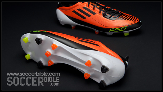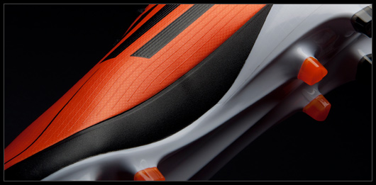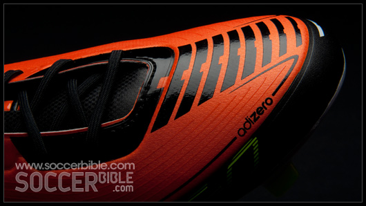 A major new feature for the F50 adizero Prime soccer shoes is the TPU Bottom Frame, which is the main design feature that stands the Prime apart from the standard adizero. Coloured black on these Warning/Black/White versions, the bottom frame offers lateral stability and support, transfers forces from the outsole to the upper and offers protection against upper abrasion.