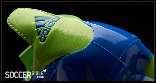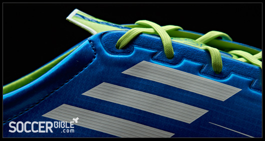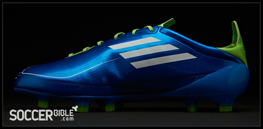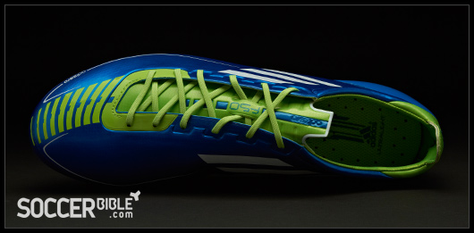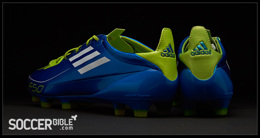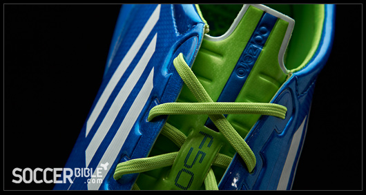 Unlike the Blue/White/Slime adizero Prime, the standard F50 adizero uses a more predominantly blue upper without the bright slime TPU bottom frame featuring on the boot. The same 'Slime' colour continues to runs through the front graphic, continuing its way up the boots tongue and heel.