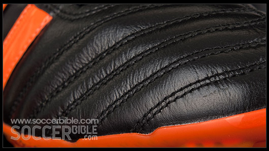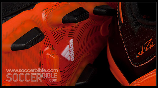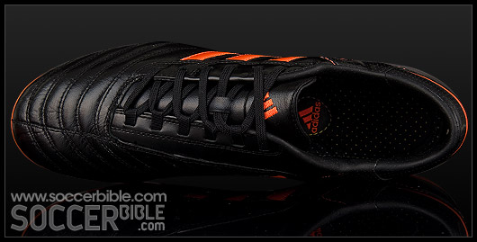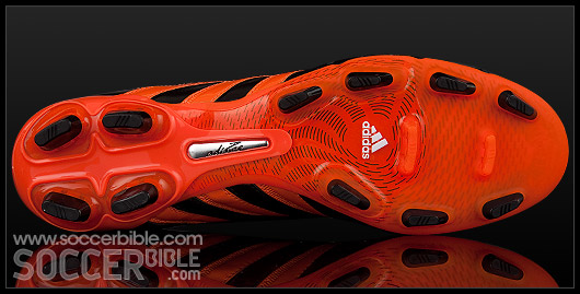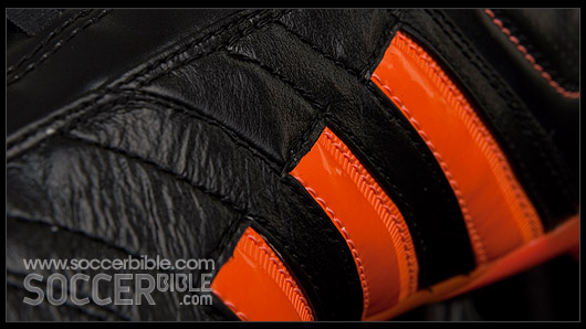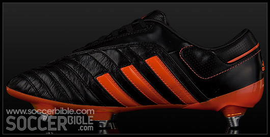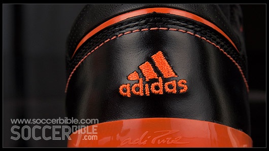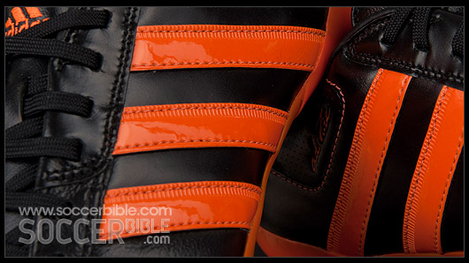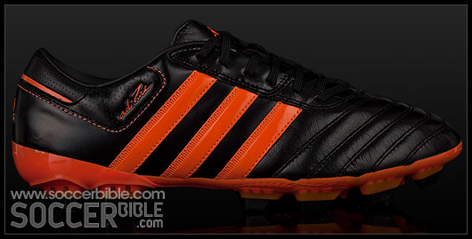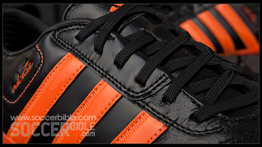 对于这个最新款的adiPure III代足球鞋,adidas重新设计了鞋领的配色方案,让它看起来略有不同。鞋领现在是黑色的皮质,并由一道橙色的装饰来点缀,同样ADI三条杠的Logo和鞋底板都是用这种橙色渲染,从而增加醒目度。