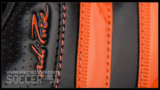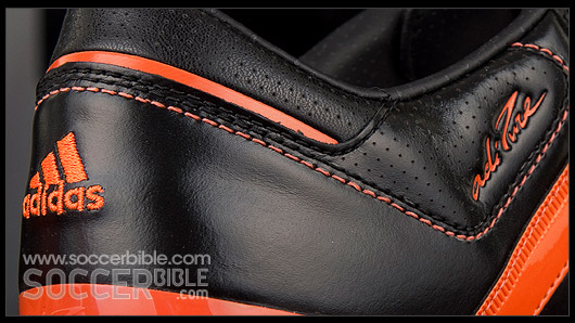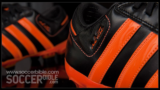 这款黑橙配色的adiPure III代足球鞋的底板结合了前掌所需要的舒适感,以及后跟所需要的支撑强度。橙色的外置鞋跟保护采用一个独立的模块,从而最大限度的为跟腱提供稳定性和保护性,减轻落地所带来的冲击力,从而提供一流的舒适度。为了提高用料标准,adidas采用了抛光皮革来提升鞋子后跟的优雅气质。