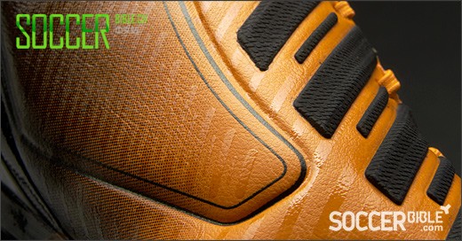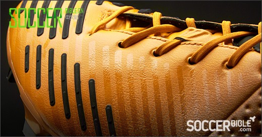 ‘Sweet Spot’区位于球鞋表面中部一个略小一些的区域,三维肋骨状摩擦条用以增加射门力量和增强球的旋转。“first touch”位于前掌脚背,采用猎鹰SL橡胶摩擦条,给合成材质的鞋面提供缓冲,提供直接触球的脚感。