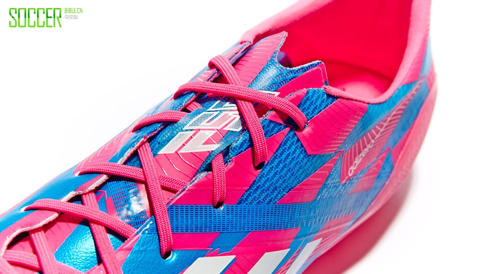 这是迄今为止,adidas为F50设计的最大胆的配色,成为了2014/15赛季最与众不同的配色。该款战靴延续了Battle Pack的设计,并通过“霓虹粉/白/荧光蓝”的炫酷配色极力吸引大家的眼球。白色的adidas的商标,粉色的鞋带,粉色的Sprint Frame大底使球鞋更加闪耀,毫无疑问将在即将到来的新赛季吸引无数的关注。