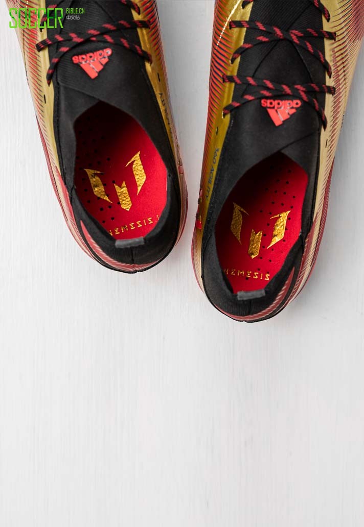 Nemeziz在夏天后就会销声匿迹的谣言愈演愈烈,倘若属实,那么这必定是梅西最后一款专属版本的Nemeziz足球鞋。或许是对先辈的呼应,鞋面大面积采用金色,这与同时亮相的 X 和猎鹰形成了鲜明的对比。除此之外,一些细微的个人化细节装饰和梅西的logo也都添加了这尊贵的金色。