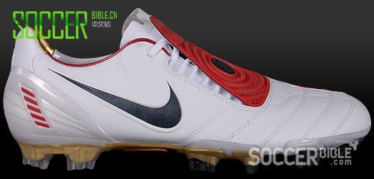 鞋面采用了白/红配色的T90 Laser 二代足球鞋将袋鼠皮与人造革的结合做到了极致。从而帮助托妞能够轻松将球送进网窝。