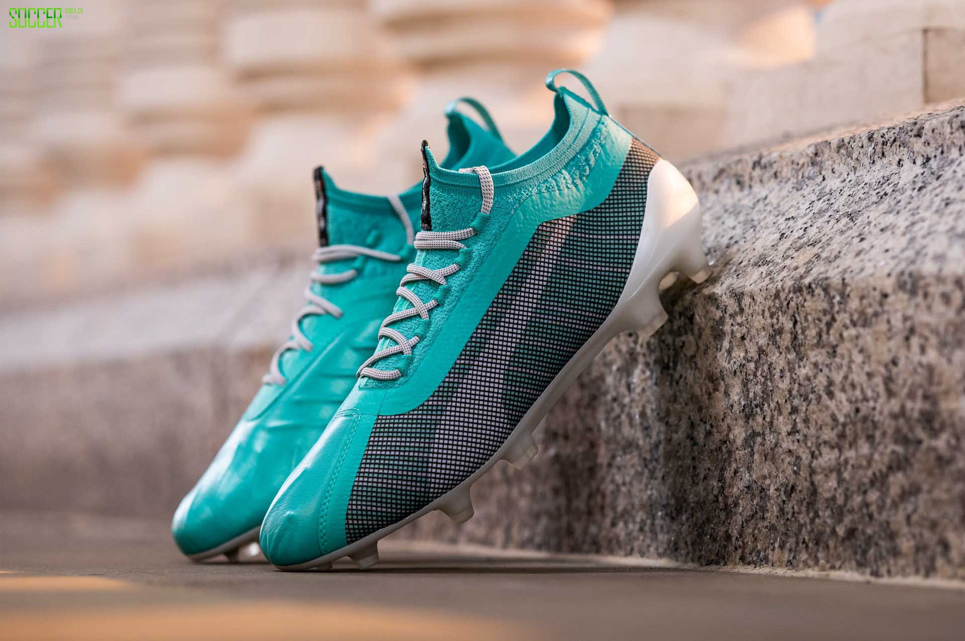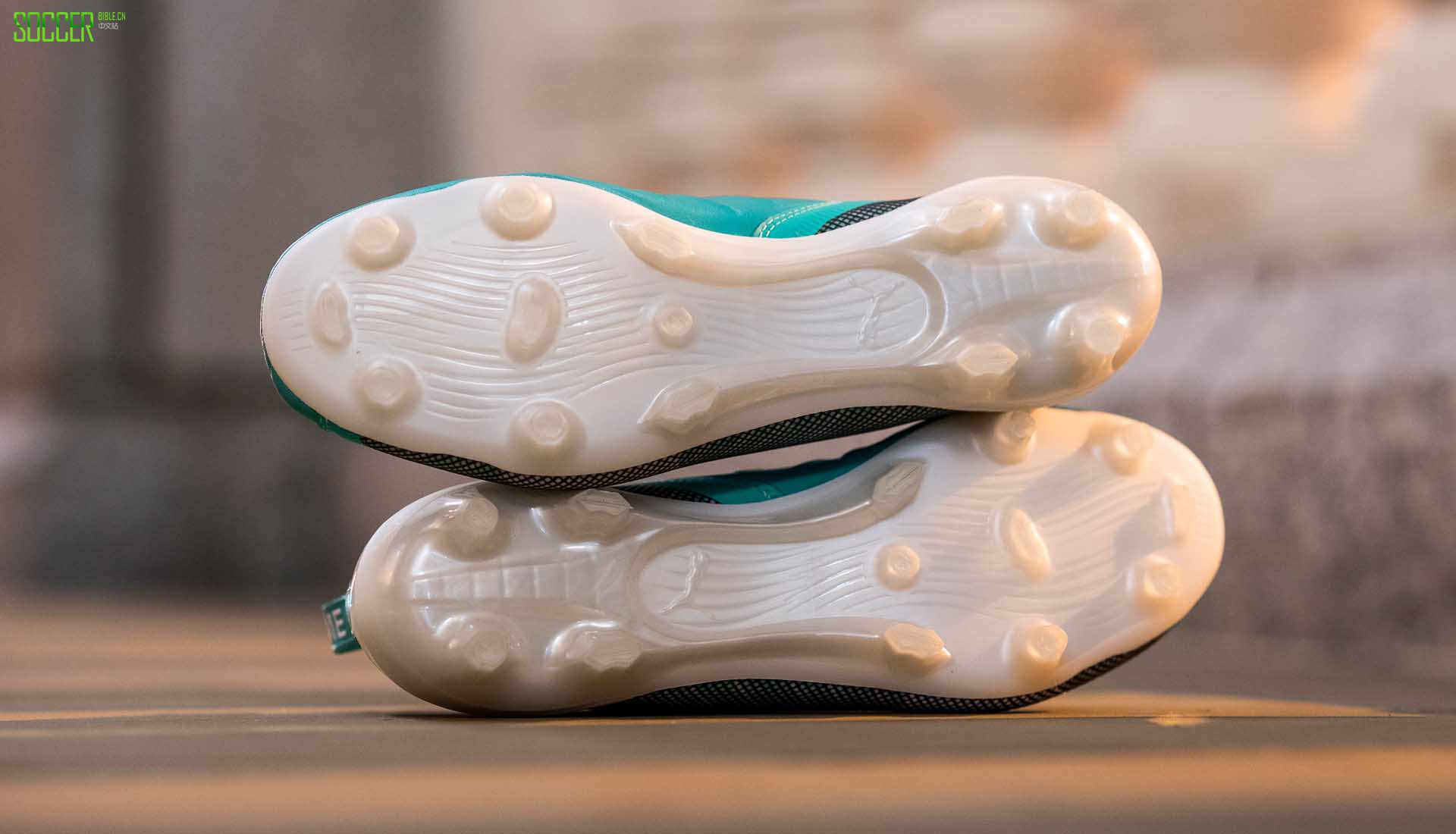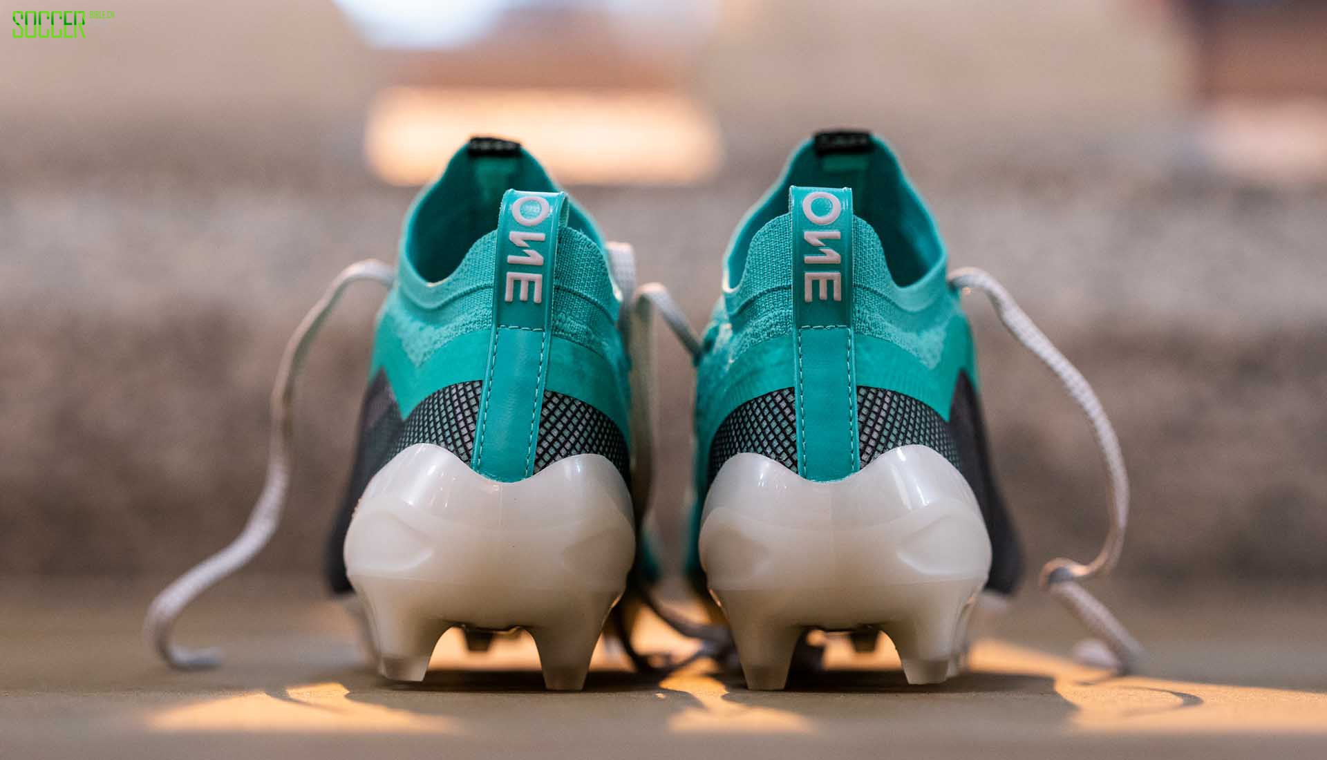 这款鞋采用了一种类似于蒂芙尼绿的冷绿色,Future4.1全身遍布了这种绿色,而ONE5.1则采用了分色设计,在球鞋外侧加入了较暗的银黑色,同时鞋带采用了反光设计。两款鞋都采用了透明的白色大底。