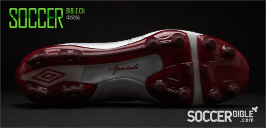 Umbro从新设计了Speciali III的鞋底,现在在鞋后跟处,四个刀钉代替了原先圆钉的位置,但在脚掌前部保留了圆钉的设计。轻量级的TPU大底提供了极佳的脚弓韧性和足跟保护,从而确保了快速运动中的稳定性,而新的注入式鞋垫进一步提供了中底和后跟的支撑和保护。