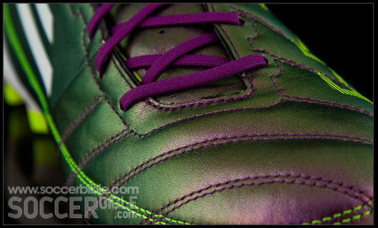 Ok, so first up, the leather edition isn't quite the same on the scales as its' synthetic sprintskin brother. Whilst that version is a mere 165g (5.8oz!), this leather edition is a non-too-flabby 175g, making this arguably adidas' lightest leather boot to date! But what it adds in a few extra grammes this release certainly makes up for in the colour stakes, with the addition of the light-flip chameleon paint job.