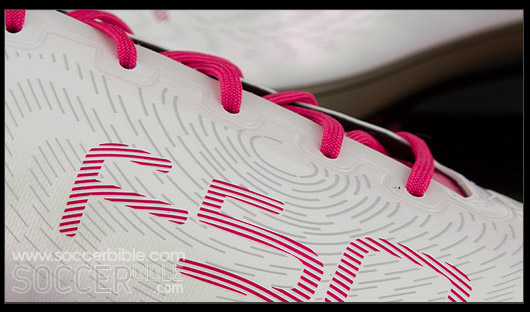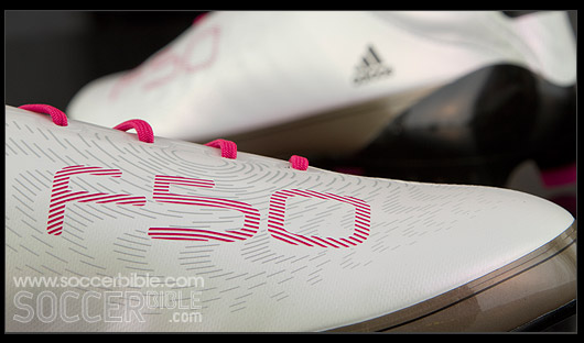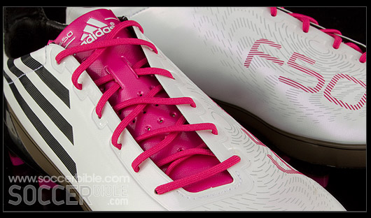 The adidas F50 adiZero adopts an asymmetric parallel lacing system which moves off-centre to create a greater, cleaner kicking surface. Also introduced is a new "Taperlace" system, intended to be much thinner and flatter to reduce any unnecessary material between the foot and the ball.