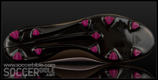 The FG plate features new triangular Traxion studs, placed at strategic positions across the sole unit which aid pressure distribution and are designed to give improved directional grip. The SG plate takes the form of a mixed sole version which substitutes 6 removable aluminium studs at the toe and heel. Both sole plates offer stability through a sleeker midfoot area which also goes to creating a snug fit.