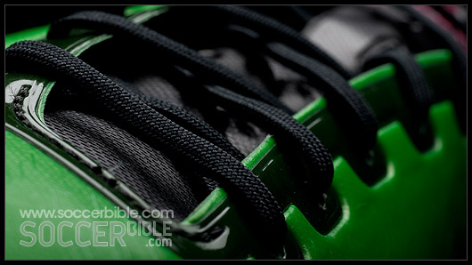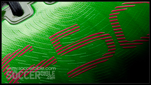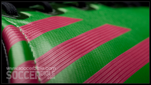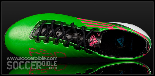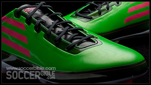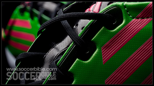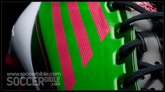 The Intense Green/Pink adidas F50 adiZero adopts an asymmetric parallel lacing system
