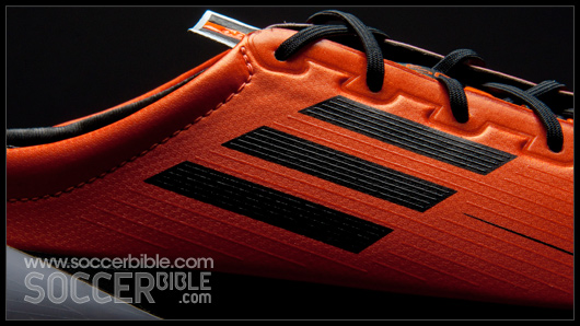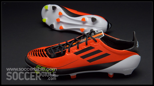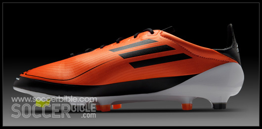 A major new feature for the F50 adizero Prime soccer shoes is the TPU Bottom Frame, which is the main design feature that stands the Prime apart from the standard adizero. Coloured black on these Warning/Black/White versions, the bottom frame offers lateral stability and support, transfers forces from the outsole to the upper and offers protection against upper abrasion.