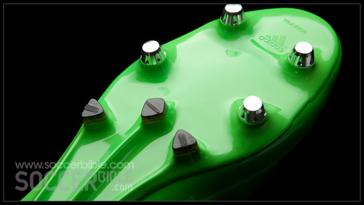 The soleplate of the new adizero RS7 Rugby boots feature a combination of molded Traxion studs and exchangeable aluminium studs. The new Traxion stud shape remains for maximum acceleration and speed on wet surfaces.