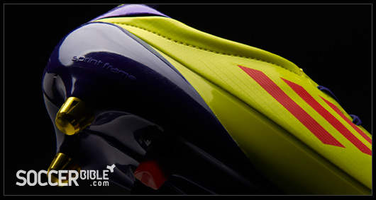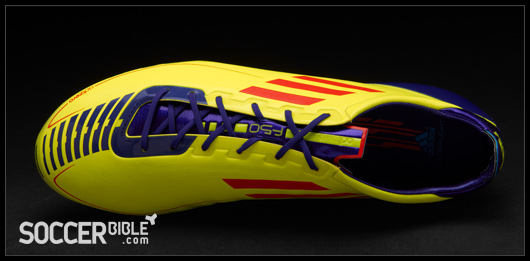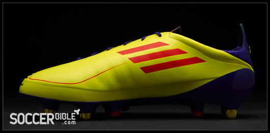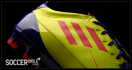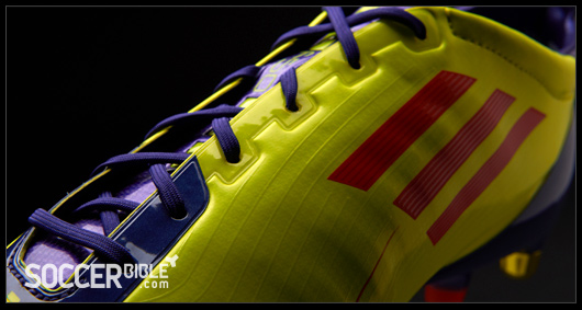 Unlike the Electricity/Purple adiZero Prime, the standard F50 adiZero uses a more predominantly yellow upper without the bright purple TPU bottom frame featuring on the boot. The same 'Anodized Purple' colour continues to runs through the front graphic, continuing its way up the boots tongue and heel.