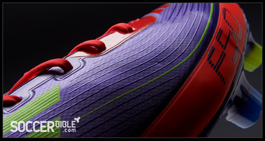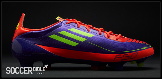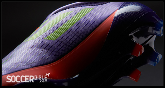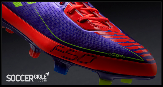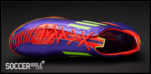 One of the innovations for the F50 adiZero Prime soccer shoes is the TPU Bottom Frame, which is the main design feature that stands the Prime apart from the standard adiZero. The band that runs around the boot and stands-out in a different colour to the rest of the boot, offers lateral stability and support, transfers forces from the out-sole to the upper and offers protection against upper abrasion.