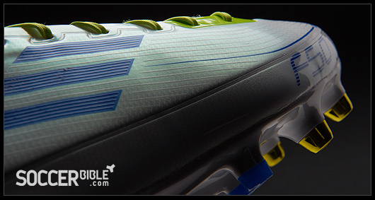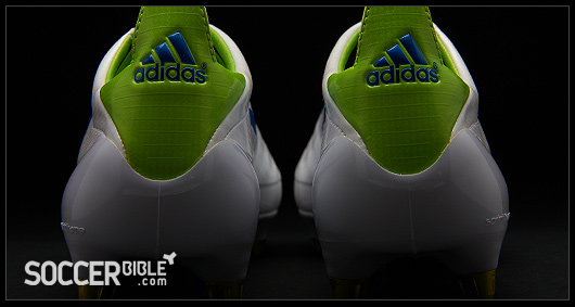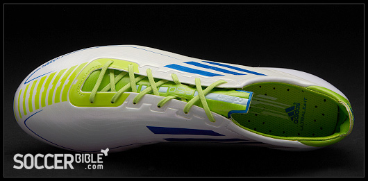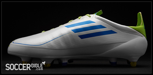 The White/Blue/Slime F50 adiZero football boots are unique in their colour combinations, as we can't recall the last boot we saw with this particular combination. The main upper uses a classy white-out, which incorporates the blue adidas 3-stripes and detailing, whilst the green is an addition that runs down the centre of the boot.