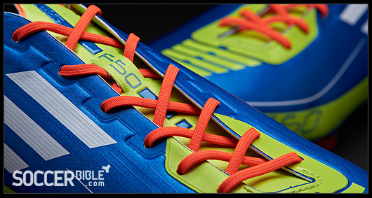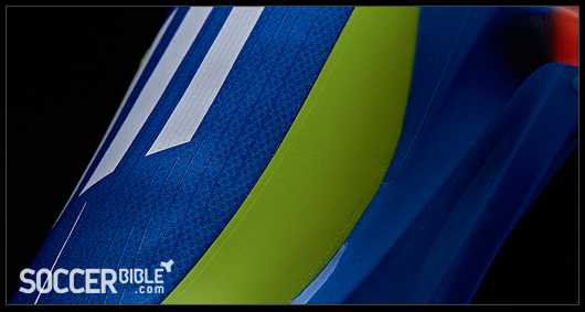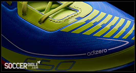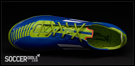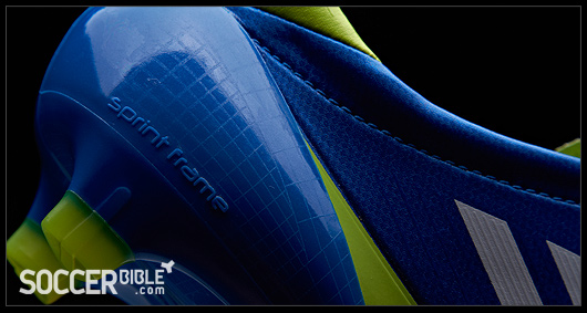 One of the innovations for the F50 adizero Prime soccer shoes is the TPU Bottom Frame, which is the main design feature that stands the Prime apart from the standard adizero. The band that runs around the boot and stands-out in a different colour to the rest of the boot, offers lateral stability and support, transfers forces from the out-sole to the upper and offers protection against upper abrasion.