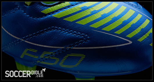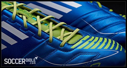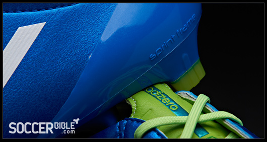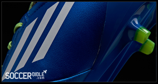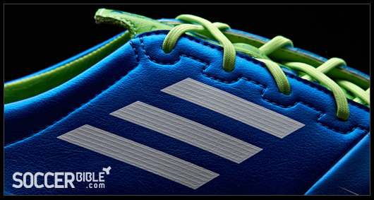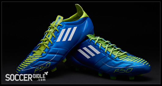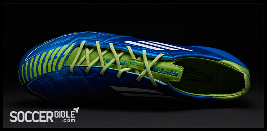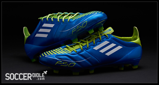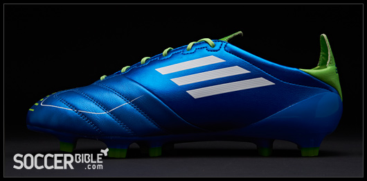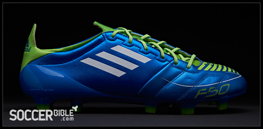 The new Blue/White/Slime adidas F50 leather adiZero football boots are certainly an eye-catching boot and are easily identifiable, not just because of the leather upper, but also because unlike the Prime versions they don't feature the Slime TPU Bottom Frame.
