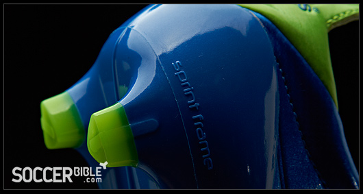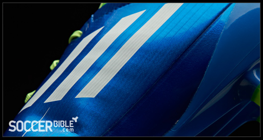 Unlike the Blue/White/Slime adizero Prime, the standard F50 adizero uses a more predominantly blue upper without the bright slime TPU bottom frame featuring on the boot. The same 'Slime' colour continues to runs through the front graphic, continuing its way up the boots tongue and heel.