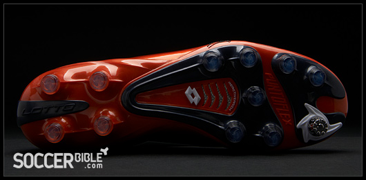 Perhaps more famous for Lotto is the Twist'n'Go pivoting stud. Designed to assist manoeuvrability and reduce the risk of injury, the impact and stress of fast directional change is softened on the foot thanks to the movement of the stud under the fore toe-area. Further enhanced by fixed conical polyurethane studs on the soles, offering stability and traction on natural firm ground surfaces.