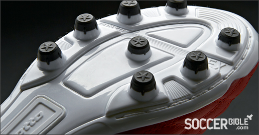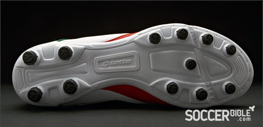 The outsole of the Lotto Stadio Potenza soccer cleats is glued to the upper and stitched around the toe area to increase the longevity of the boots. The Lotto Potenza utilises traditional conical fixed polyurethane studs to offer stability and traction on natural firm ground surfaces.