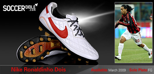 Brazil and Milan star Ronaldinho has his own range of Nike Tiempo football boots named the Ronaldinho Dois. Originally released in black /sail red the latest release are a tribute to Ronaldinho's AC Milan football kit featuring a white/red/black colourway.