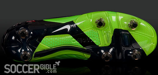 Complimenting the Instep Pods are strategically angled and raised Fins, to create friction and increased ball spin for shooting and passing. Each fin is positioned at a different angle and a different height (0-3mm),