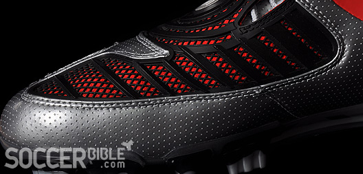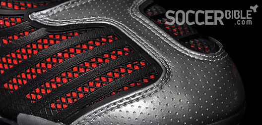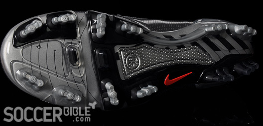 The synthetic upper of the new silver/red/black Nike T90 Laser II football boots features a textured surface to increase friction between the boot and the ball. This will assist ball control all over the boot, and give a more aggressive contact when passing and shooting the ball. The upper also has Nike's waterproof eVent technology, which lets sweat escape and maintains a constant temperature inside the boot with enhanced breath-ability and air circulation.