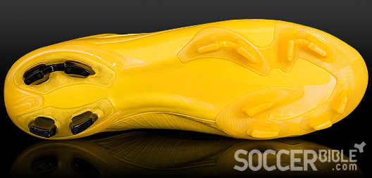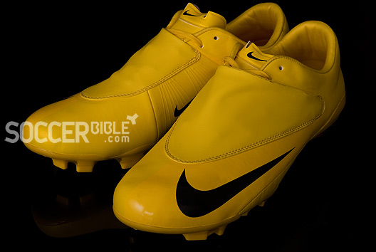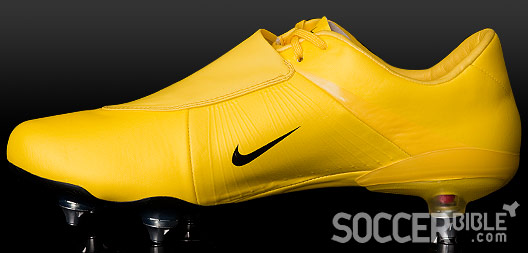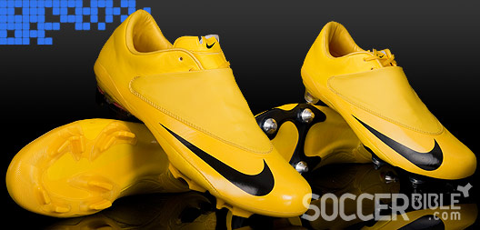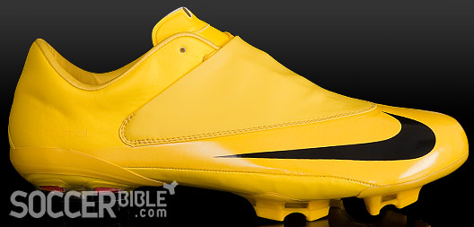 The vibrant yellow Mercurial Vapor V football boots weigh in at a mere 230grams (for a UK size 8) and are available in a firm ground and soft ground sole-plate. The studs on the firm ground versions are