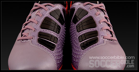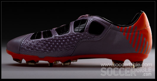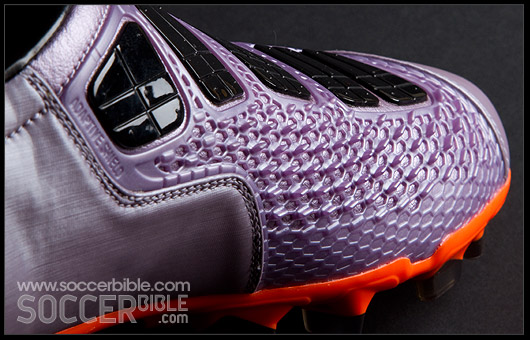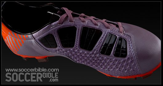 Complimenting the Instep Pods are strategically angled and raised Fins, to create friction and increased ball spin for shooting and passing. Each fin is positioned at a different angle and a different height (0-3mm), to enable the player to control the swerve ball in multi-directional ways depending on how the player kicks the ball, for better ball spin and kicking accuracy.