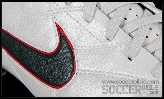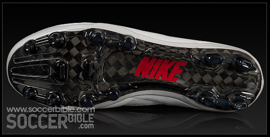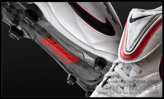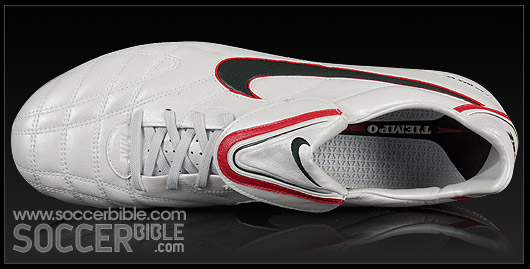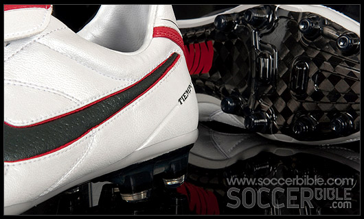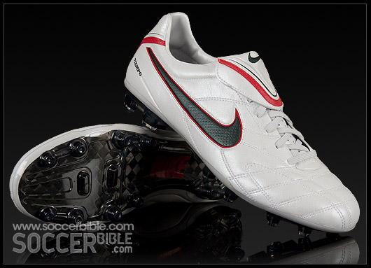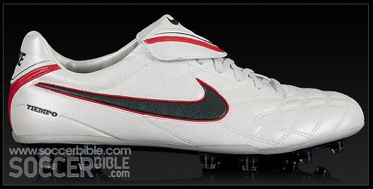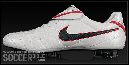 Gone is the lairy colourway of the launch Elite series, replaced by a much more acceptable Whtie, Grey and Red combination which more suits the classic lines of the Tiempo series. The blacked out carbon-fiber chassis features retro Nike insignia and stylishly compliments the clean white upper.