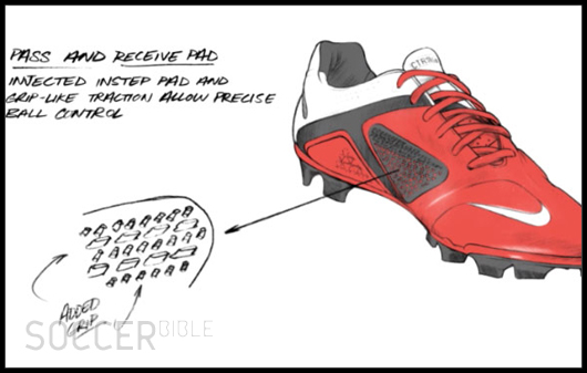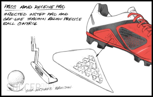 This 'Pass and Receive Pad' is an injected instep pad with grip-like traction that allows precise ball control. The design of this has been inspired from the grip design featured on a Nike golf putter.