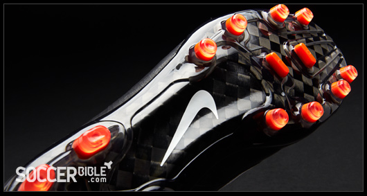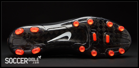 The carbon-fibre plate, first introduced in 2010, remains in the Nike Tiempo IV Elite. Usually a boot will have another layer of infrastructure made of TPU, but the carbon-fibre has enough structure alone, taking the player lower to the ground and therefore giving the boot greater response. The carbon fibre sole unit reduces the weight of the Tiempo by 40g, making it more responsive and ensuring greater performance.