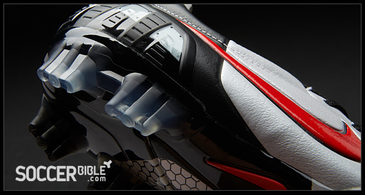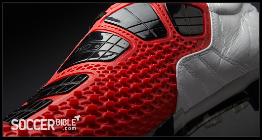 The ShotShield on the Laser III soccer shoes has been divided into two zones. The first zone maintains an even pressure on the ball at impact for accuracy, which is through the five flat longitudinal and flexible Instep Pods.