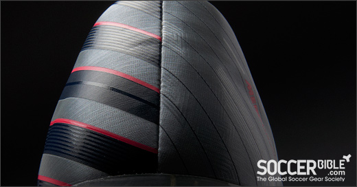 As CR moves into position or tracks back the left side of his boot reveals a subtle pinstripe effect with a clear screen and pattern treatment. In contrast, the right side features a bold contemporary stripe of Mach blue and Solar red which is a signature color theme throughout the collection. Together, the boot graphics will create a striking flicker effect on pitch to stand out in the heat of game day competition.