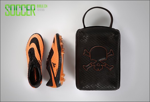 To mark his Nou Camp debut, Nike sent Neymar a special leather boot bag featuring a laser pattern inspired by the upper of the Hypervenom boot. The Hypervenom skull motif is hand-cut and stitched in Hypervenom orange to contrast against the black leather, and a small side compartment makes room for his personal items.