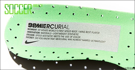 Other than the obvious link on the heel to the Mercurial 98 you have to search a bit harder to find others. Inside the boot there's a small fact box on the sock liner explaining the story further; the moment the inspiration for the boot comes from - Brazil's Ronaldo wearing the first ever speed boot and Nike also share a secret fact that the Mercurial was almost named the Ultravelox.