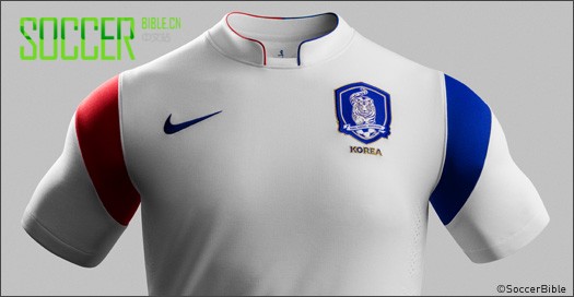 The red and blue interlocking shape from the Taegeuk appears at the top of each sleeve, with the right shoulder red and the left blue, giving the jersey a modern appearance and matching the contours of players’ bodies. The new away shorts and socks are white.