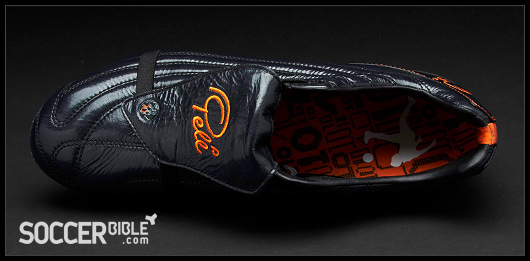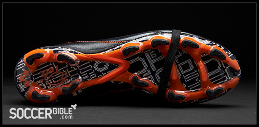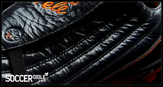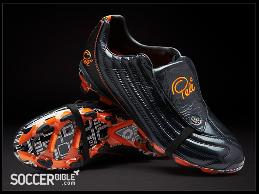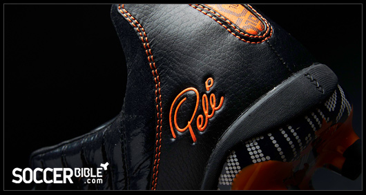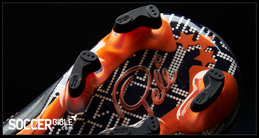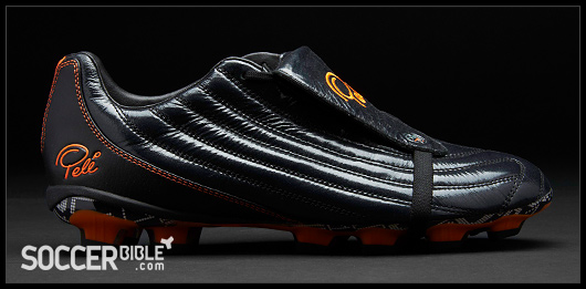 The quality of the upper is emphasised through the boots clean, classic design. The iconic Pele signature adorns the outside heel of the boot and tongue, coloured to match the stitching around the heel area. Modern design takes over the sole plate, with a dot matrix style print pattern made from number ''10s'' – the number made famous by Pele.