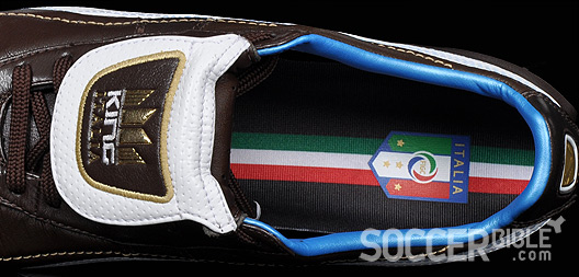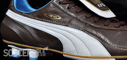 The brown leather of the special edition Puma King XL Italia football boots is a full grain super-soft material. The soft leather upper has been a feature of Puma King football boots since the 1960s, because Puma know that when it comes to performance a good touch and feel for the ball is very important, and despite a host of modern materials on the market a good quality leather is reliable.