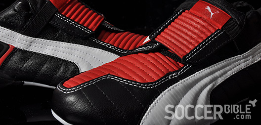 The Puma v-Konstrukt III is a very uniquely designed football boot, with natural and synthetic materials combining for a very well constructed boot. The full-grain leather is soft and comfortable, with parallel stitching to hold the boots shape around a padded textile 'strike zone'. This 'strike zone' continues onto the tongue which folds over the laces, and is held down by an elastic strip attached to the boot and not the tongue.