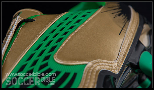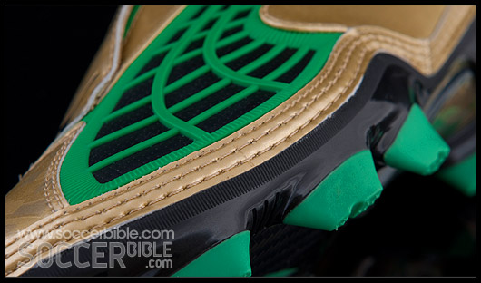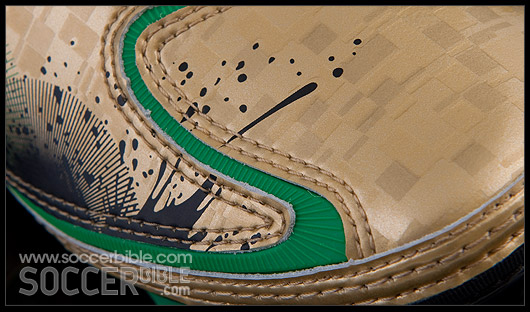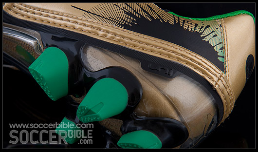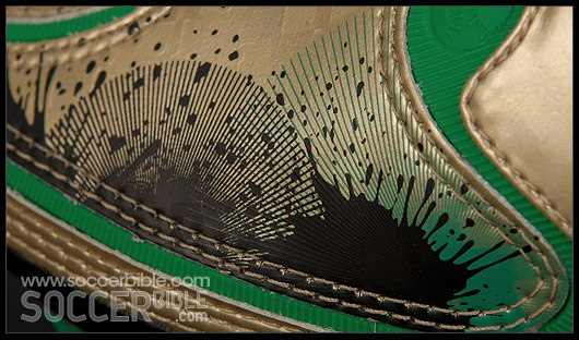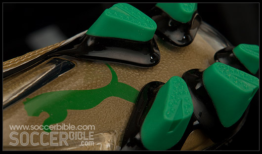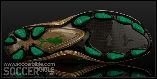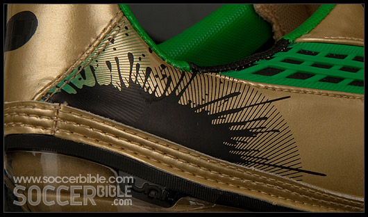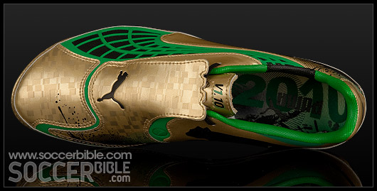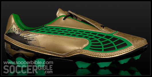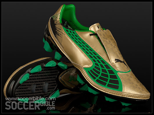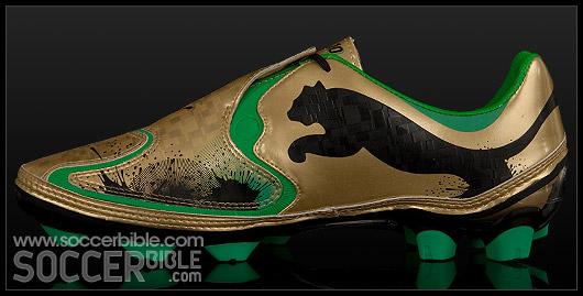 The Gold/Black/Fern Green colourway continues the high performance standards of the v1.10 range, which is popular with such star players as Samuel Eto'o. But with Cameroon and Eto'o exiting the World Cup, Puma have lost their star player, so boot spotters will be keeping their eyes peeled to see who Puma put in these new boots.