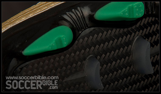 A one-piece speed outsole incorporates a carbon-fibre plate, to provide pressure distribution, reactivity and flexibility, whilst movement is further complimented by the pointed stud configuration, to ensure smooth ground penetration for optimal traction.