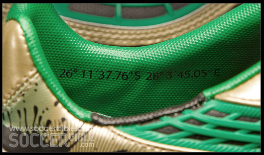 As with the Puma Unity kits, Puma have incorporated elements of their Love = Football campaign, with designs splashed over the upper of the boot. And printed on the inside of the Puma v1.10 JB Final boot is a very unique feature, the coordinates for the location of Johannesburg Stadium. Although this has left us scratching our heads slightly, as Johannesburg Stadium is the 37,500 capacity home of Orlando Pirates, not Soccer City where the World Cup final is being held!