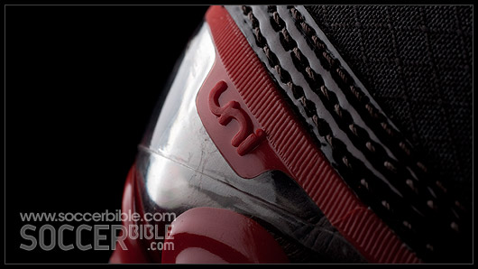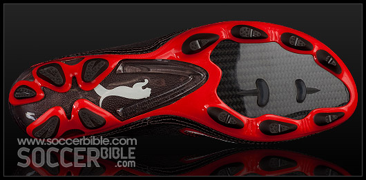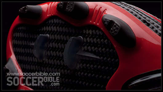 Speed performance comes from the one-piece outsole, with carbon-fibre embedded into the forefoot to distribute pressure and react to the foot flexing. In the midfoot of the sole-plate there is a TPU reinforcement (shaped in a 'V') to help with stability and prevent the midfoot bending. The studs are mounted on a lightweight frame, and shaped for smooth ground penetration to optimise traction.