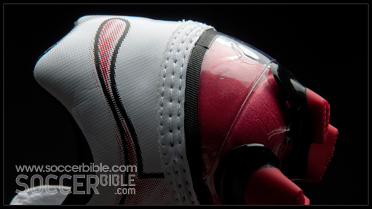 Covering the main upper from back to front, the microfiber material provides a great striking surface, and is covered with a print application to increase friction, ball control and accuracy. Similar to thin leather, the microfiber material is soft and flexible, but has the advantages of being highly abrasive resistant.