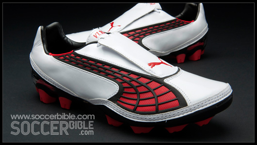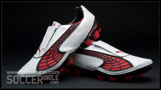 The Puma v1.10 football boots have begun 2011 in good fashion with this great looking new color way. Color ways are the hot topic at the moment with the new adizero boots causing debate but Puma have kept it simple with the white/red/black combination that comes together to create a clean look. Check out all of our exclusive SoccerBible images of the new Puma v1.10 football boots…