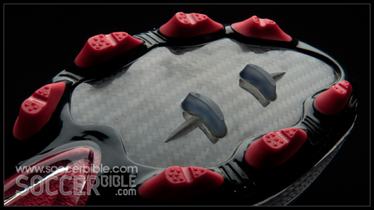 Speed performance comes from the one-piece outsole, with carbon-fiber embedded into the forefoot to distribute pressure and react to the foot flexing. In the midfoot of the sole-plate there is a TPU reinforcement (shaped as a 'V') to help with stability and prevent the midfoot bending.