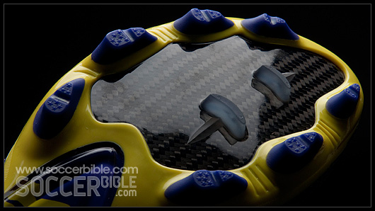 Speed performance comes from the one-piece outsole, which has carbon-fibre embedded into the forefoot to distribute pressure and react to the foot flexing. In the midfoot of the sole-plate there is a TPU reinforcement (shaped as a 'V') to help with stability and prevent the midfoot bending. The studs are mounted on a lightweight frame, and shaped for smooth ground penetration to optimise traction.