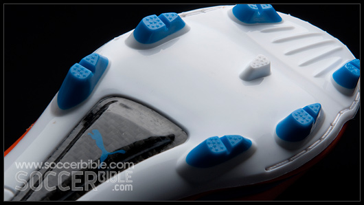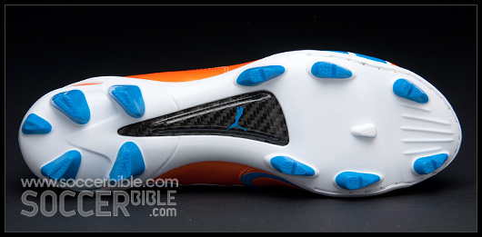 The out-sole and external heel counter of the Puma v1.10 SL football boots has been engineered from a revolutionary Thermoplastic. The Pebax material offers outstanding mechanical, physical and chemical properties, by bridging the gap between thermoplastics and rubbers. In short, this means the v1.10 SL's out-sole offers stability, durability and support at a fraction of the weight. And is further complimented by a Carbon Fibre insert in the out-sole, enhancing player movement through reactivity, flexibility and mid-foot stability.