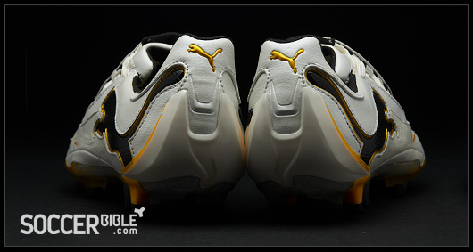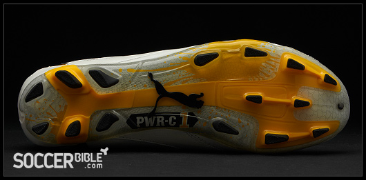 The outsole of the Puma PowerCat 1.10 soccer cleats have an external TPU-injected heel counter. This is lightweight and 'finger-shaped' to cradle the heel of the foot, and provides optimal support and stability during movement and ball striking, whilst offering protection. The outsole also features a new bladed stud configuration, to ensure smooth ground penetration and pressure distribution, while providing maximum traction and manoeuvrability.